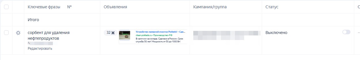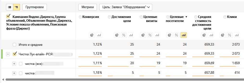 - Непроработанная структура аккаунта — ключевые фразы не были разбиты по направлениям (лазерная сварка, лазерная чистка), что не позволяло распределять бюджет.