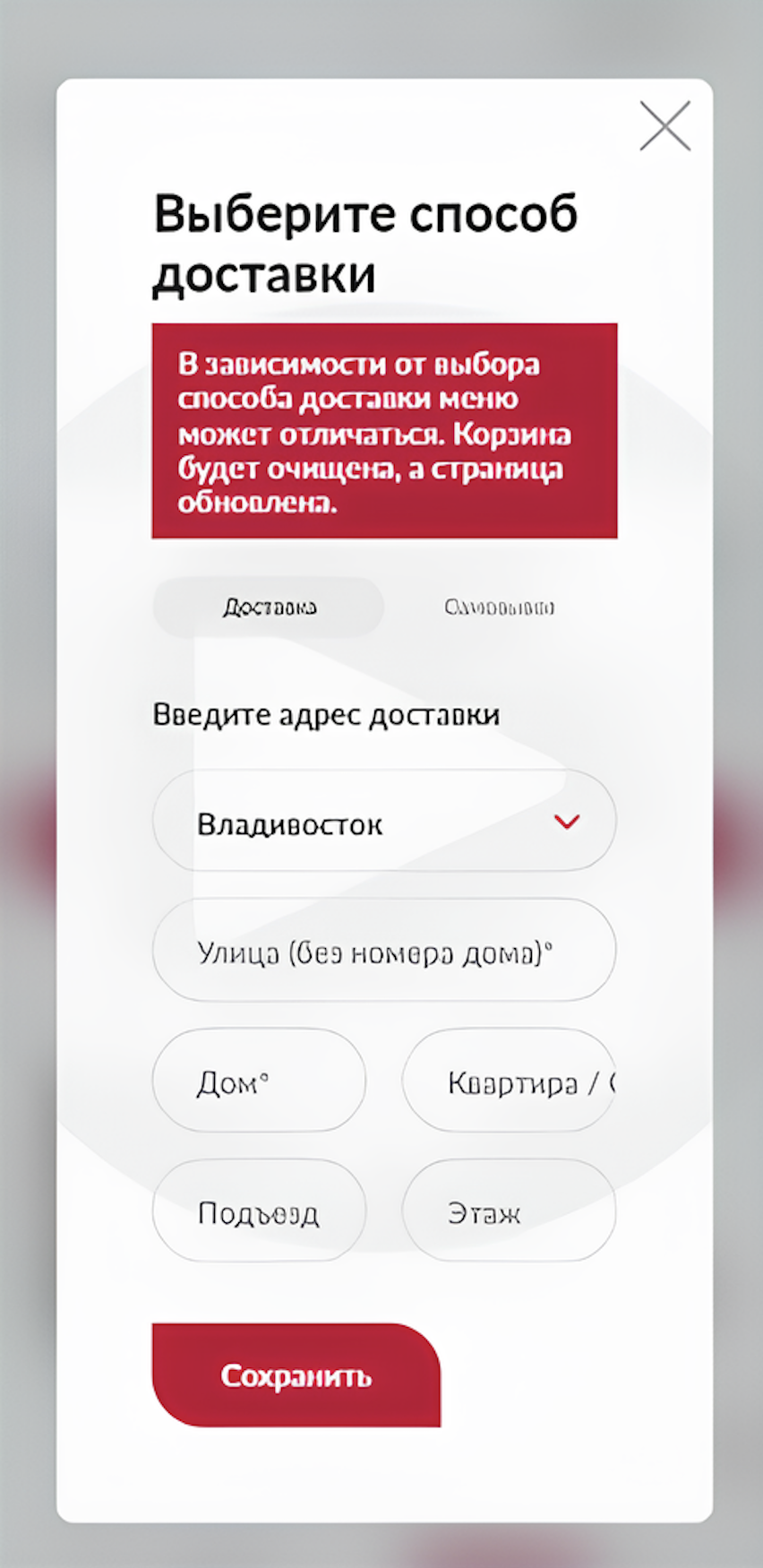 Мы предложили убрать поп-ап, чтобы способ доставки нужно было вводить только в конце заказа — когда пользователь уже выбрал блюда и начал оформлять доставку.