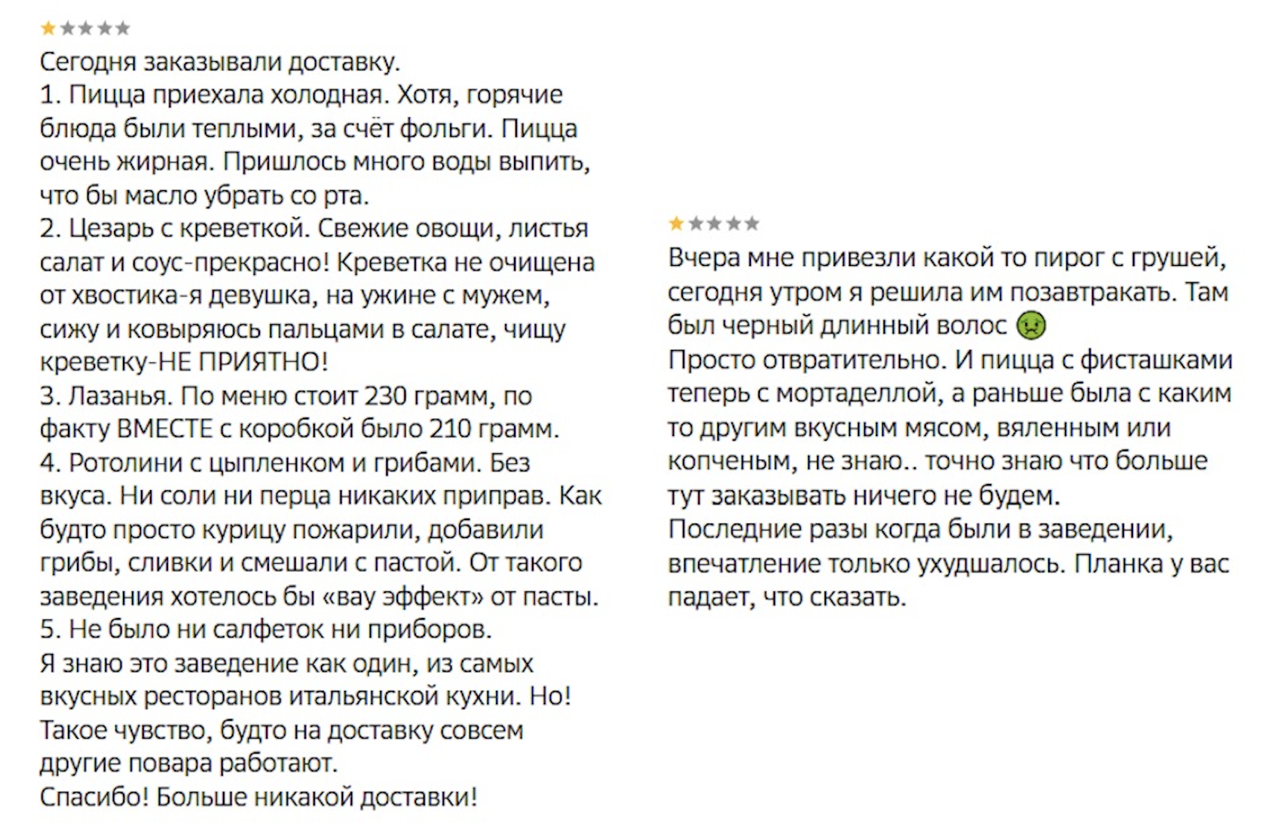 У ресторанов был высокий рейтинг, но плохие отзывы о доставке. В Яндекс Картах стояла оценка 4.7, в 2ГИС — 4.6, в Яндекс Еде — 4.8. Когда посетители приходили в ресторан, отмечали вкусную еду, приятный интерьер, вежливых официантов. Но если заказывали на дом, жаловались на холодные блюда, долгое ожидание, недовес и плохую сервировку.