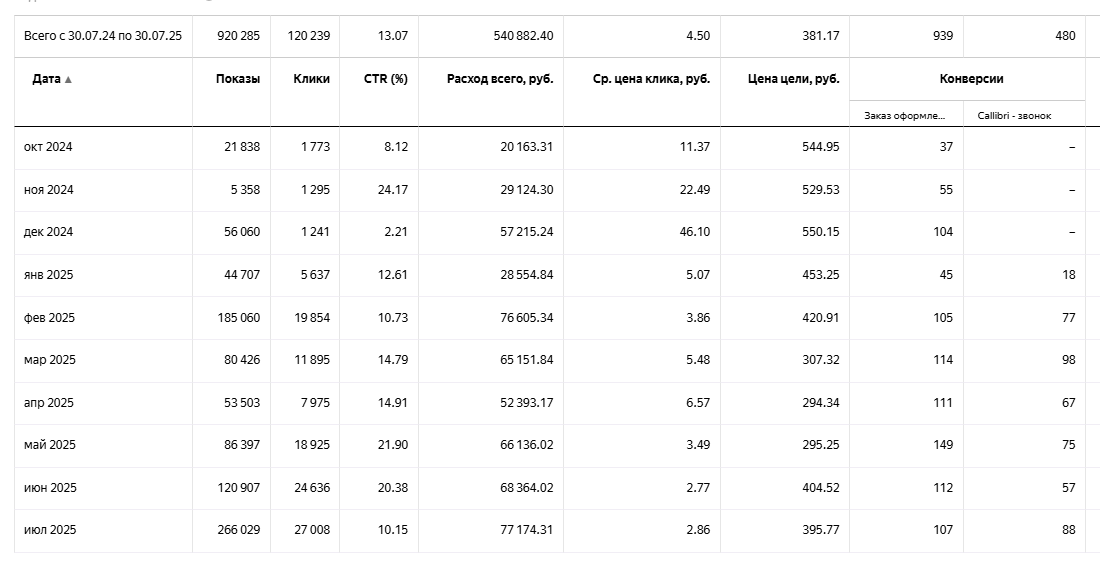 Подключили коллтрекинг от Callibri. Это система, которая отслеживает реальные звонки с сайта или из рекламы. Раньше мы видели только клик по кнопке «позвонить», но это не всегда означает, что звонок действительно состоялся — человек мог передумать или нажать случайно. Поэтому мы не использовали цель «клики по кнопке», чтобы оптимизировать кампанию.
