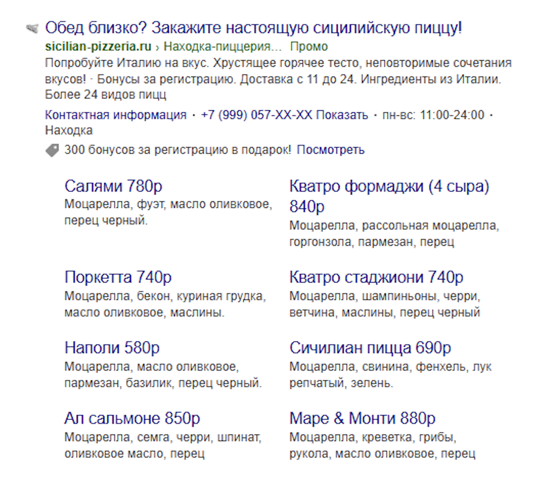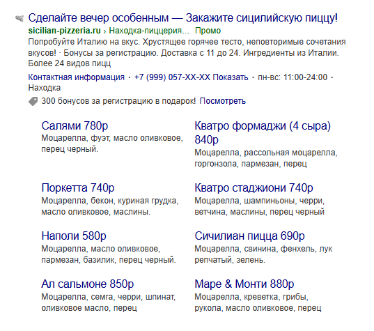Плюс адаптировали тексты объявлений под конкретное время и добавили быстрые ссылки на 8 популярных пицц.