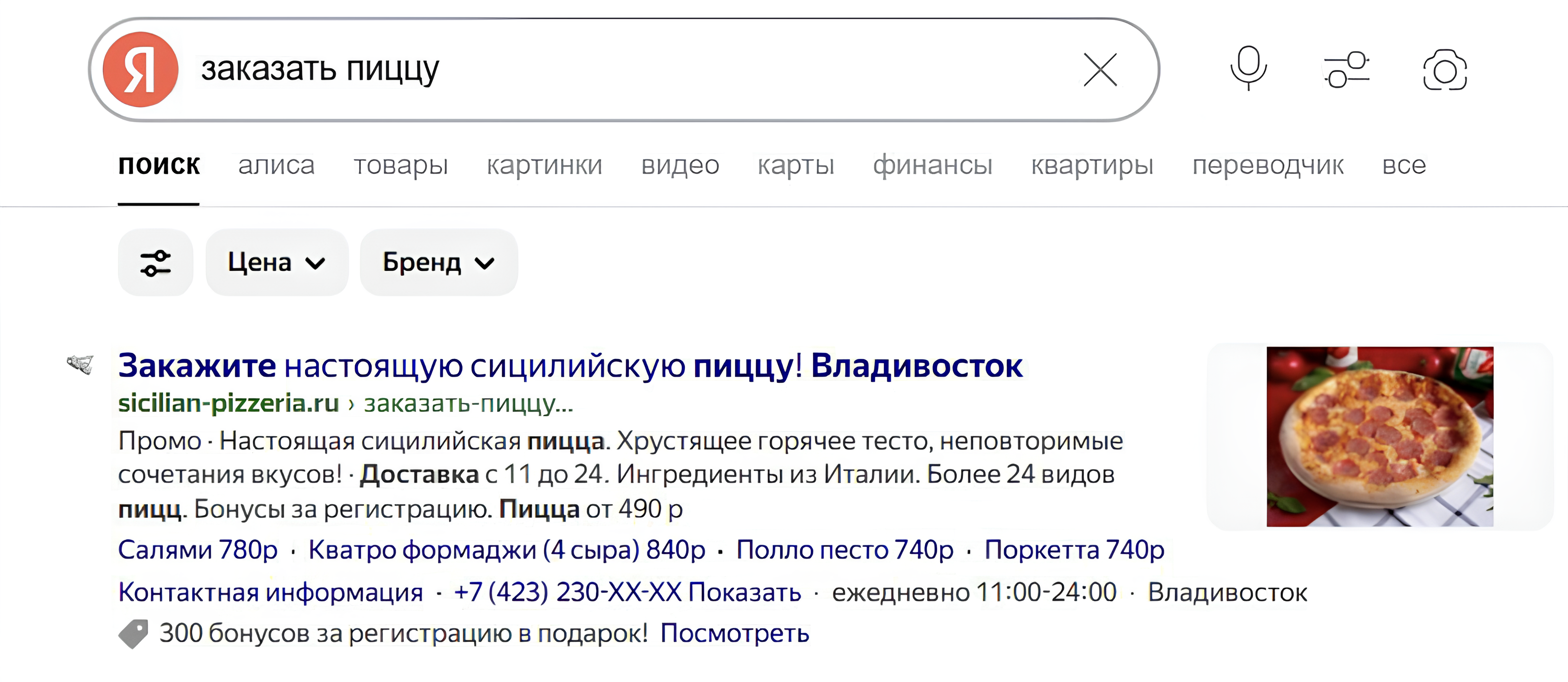 - Поисковые кампании по «горячим» запросам. Например, «пицца заказать Владивосток».