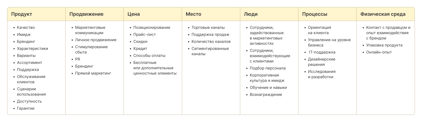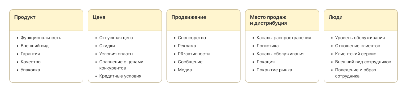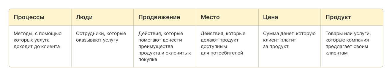 В сложных продуктах — например, в B2B или сервисах — базовой модели может не хватать. В таких случаях добавляют «людей», «процессы» и «среду», чтобы акцентировать внимание на качестве сервиса и клиентском опыте.