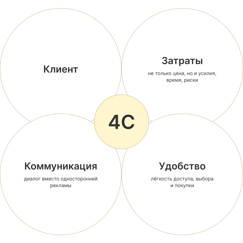 В отличие от классической модели, 4С смещает фокус с товаров и действий бизнеса, на потребности и ощущения покупателей. Это «перевёрнутая» модель, которая трансформирует каждое «P» в соответствующее «C»: