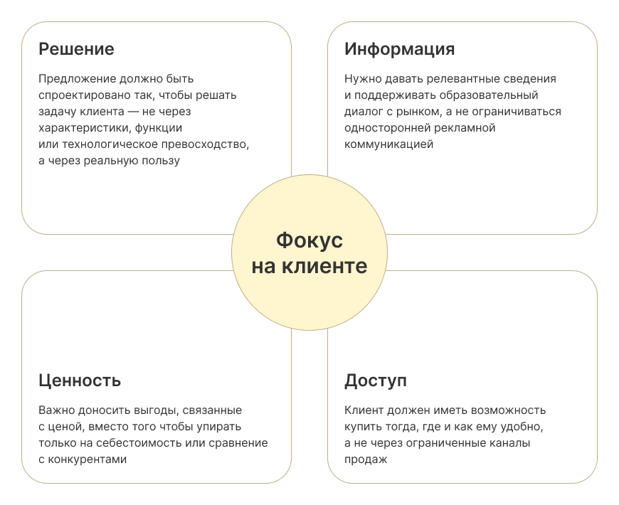 Ориентируйтесь на клиента. Спросите себя: «Насколько продукт закрывает задачу клиента? Удобно ли его купить?», «Что чувствует человек при взаимодействии с брендом?» В таких случаях помогают модели 4C или SIVA, где фокус смещён на восприятие и опыт пользователя.