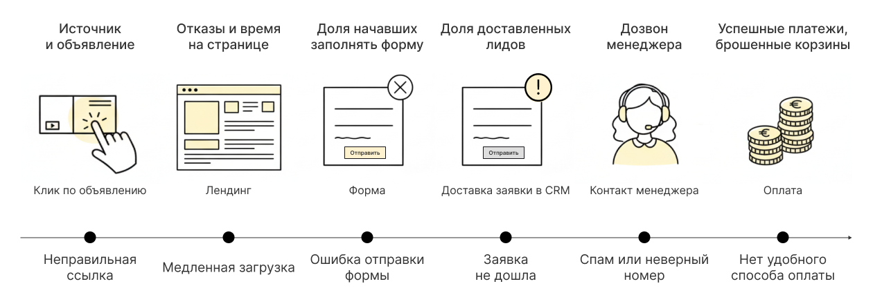 Определите, на каком этапе теряются заявки и почему люди не доходят до покупки. Пройдите путь клиента сами или попросите об этом коллег: заполнить форму, оставить заявку, попробовать оплатить. Зафиксируйте, где и почему возникают сложности.