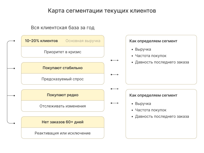Разделите клиентов на группы по выручке. Как правило, основную долю оборота дают 10–20% покупателей — это ваш приоритет. Выгрузите всю историю заказов за последний год и посмотрите, кто, когда и сколько денег принёс. Проверьте, когда был последний заказ.