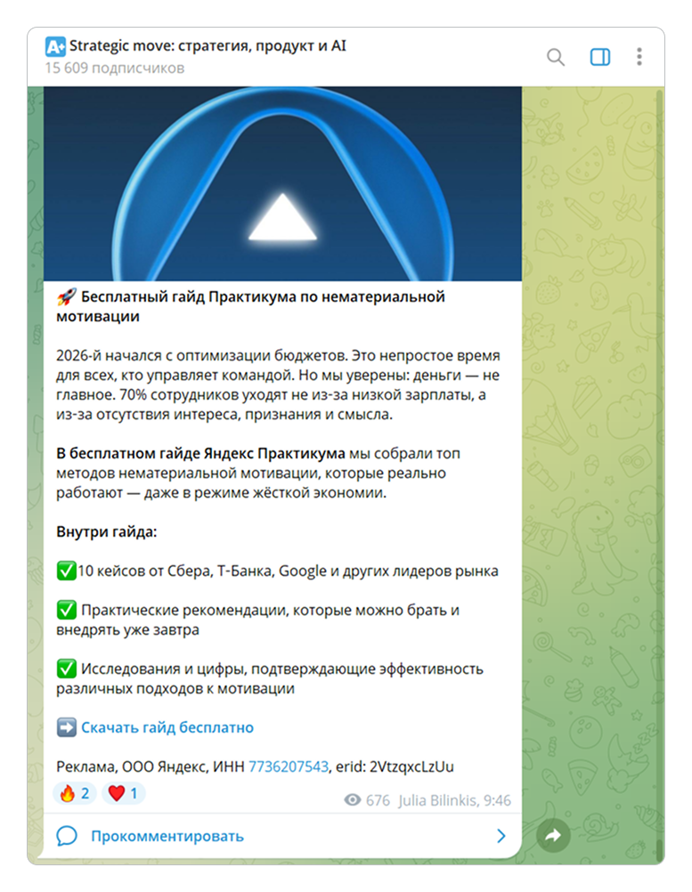 Например, в Telegram-канале блогера выходит пост с предложением скачать бесплатный гайд по нематериальной мотивации. Автор канала прикрепляет ссылку на материал и коротко объясняет подписчикам, что ждёт внутри. В конце обязательно добавляет строку маркировки — иначе это нарушение.