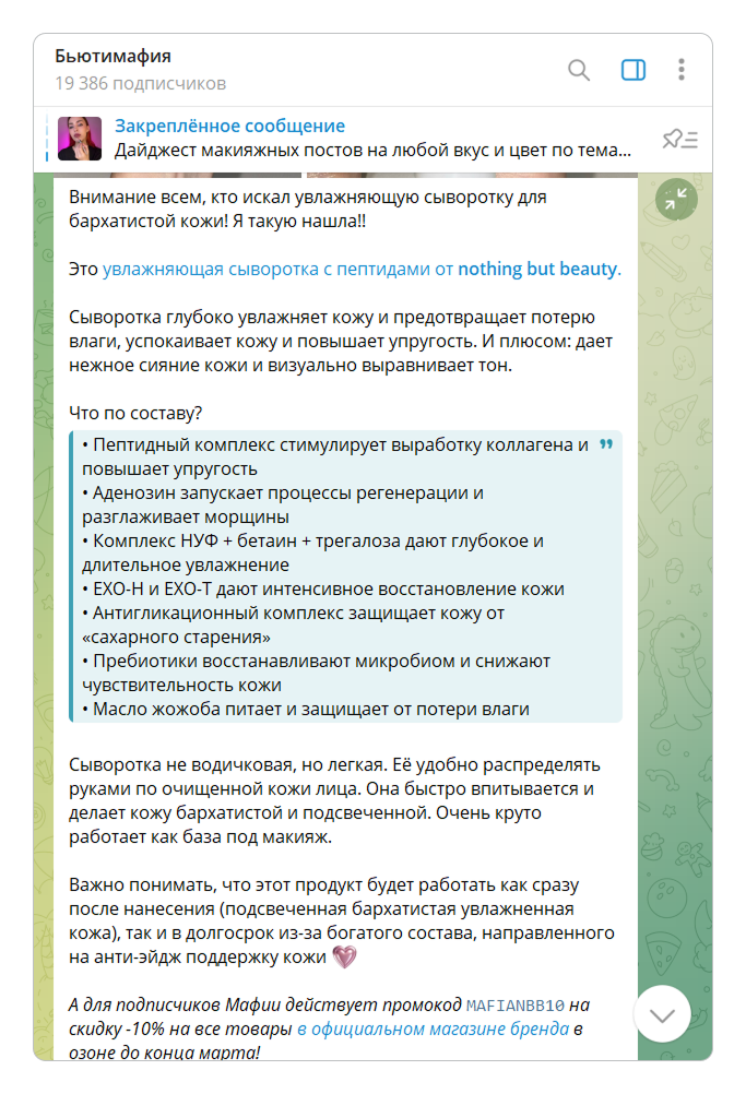 👉 Так, пост в канале «Бьютимафии» — это классическая реклама. Автор фокусирует внимание на конкретном продукте, подробно расписывает его состав и преимущества. В конце поста добавляет промокод на скидку и ссылку на магазин бренда.
