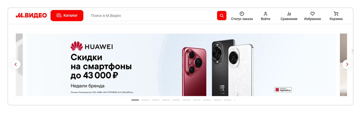 👉 Ещё один пример — баннер на главной странице М.Видео с анонсом акции на смартфоны Huawei. Это тоже реклама, хотя здесь и нет кнопок «Купи» или «Закажи». Работает другой принцип: площадка берёт один бренд и ставит его на самое заметное место. Огромная картинка с обещанием выгоды до 43 000 ₽ сразу бросается в глаза и выделяет эти смартфоны среди тысяч других товаров в каталоге. Это типичное привлечение внимания к конкретной марке, поэтому в углу баннера стоят данные рекламодателя и код erid.