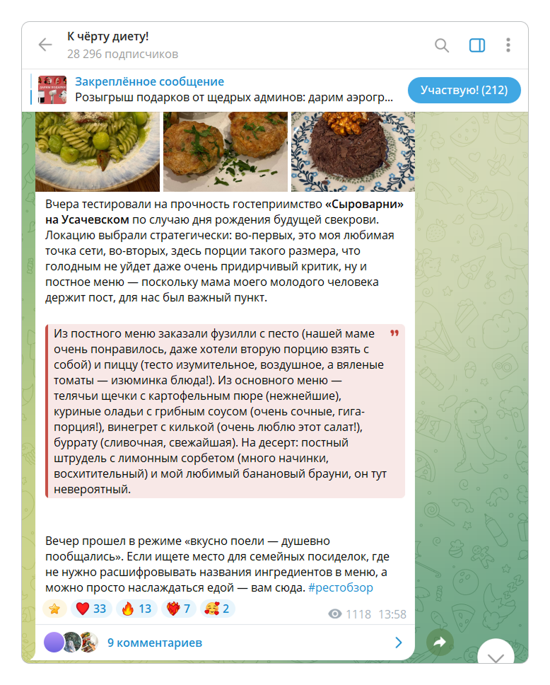 ✅ Рассказ о походе в ресторан с описанием блюд и атмосферы. В тексте нет ссылок на бронирование или призывов посетить заведение. Это личный опыт, а не продвижение бизнеса.