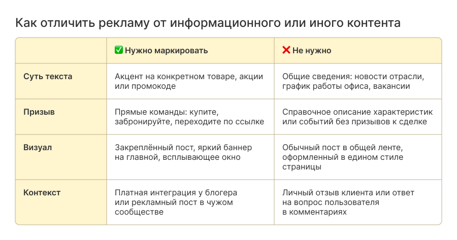 Если коротко, маркировка нужна любому контенту, который продвигает что-либо и побуждает к действию. Вот на что стоит обратить внимание: