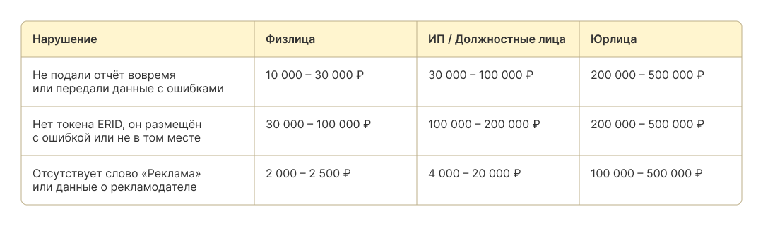 Штрафы начисляют по каждому нарушению. Суммы зависят от того, что именно забыли сделать — например, получить токен или поставить пометку «Реклама».