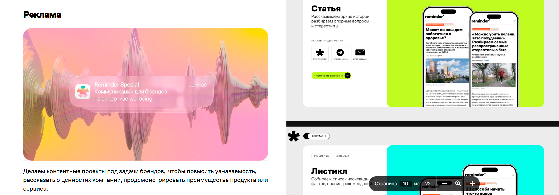 Оформлять медиакит лучше в вертикальном формате — так его будет удобнее смотреть с телефона. Также важно, чтобы файл не весил слишком много и легко загружался. Начать всегда проще с PDF-файла, а после, при наличии ресурсов, можно сделать отдельный лендинг в формате медиакита.