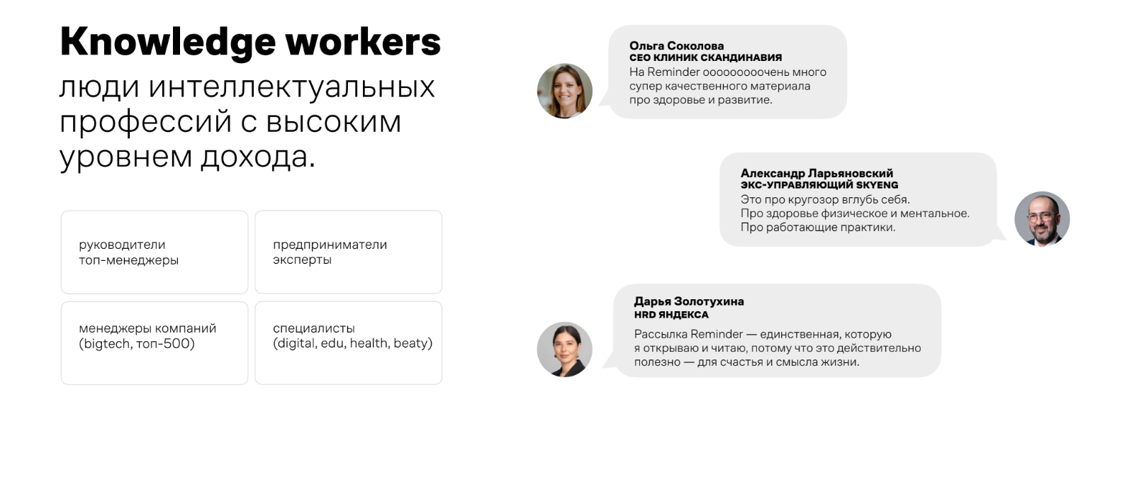 Отзывы. Они помогают сделать бренд «живым» и вызывают доверие. Лучше использовать конкретные комментарии, в которых клиенты рассказывают, какую задачу решили с помощью продукта или услуги. Чтобы собрать отзывы, приходите к клиентам за обратной связью и сразу добавляйте её в медиакит.