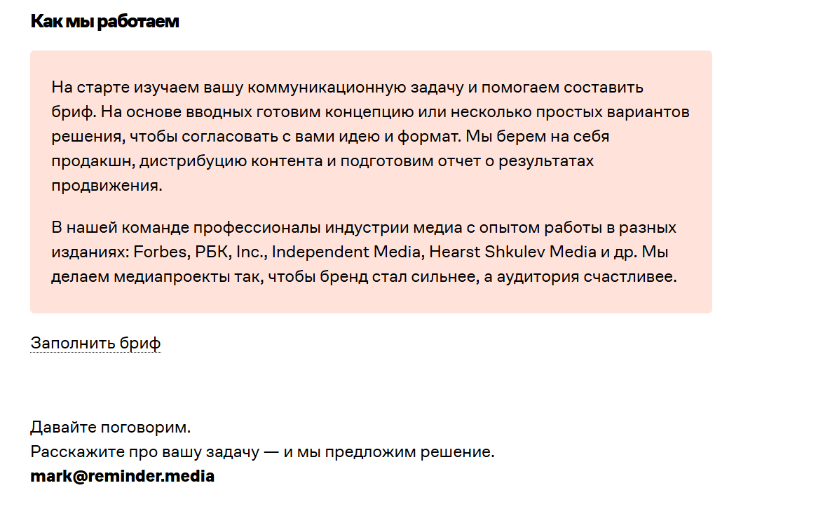 Контакты. Потенциальные партнёры должны сразу понимать, как с вами связаться. В блоке с контактами можно оставить ссылку на бриф, соцсети или указать почту для связи. Хорошо, когда есть несколько способов связи.