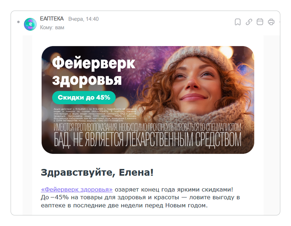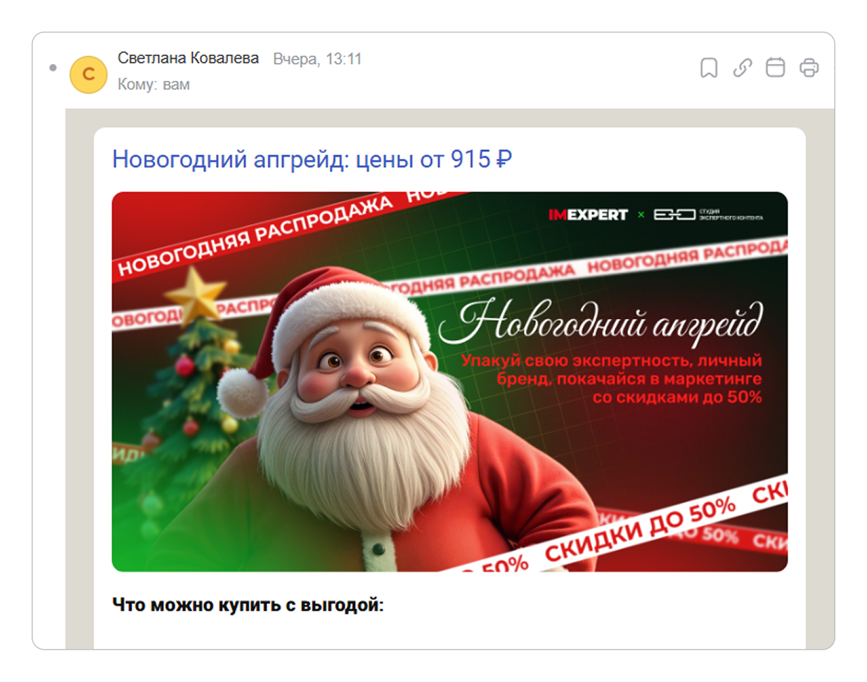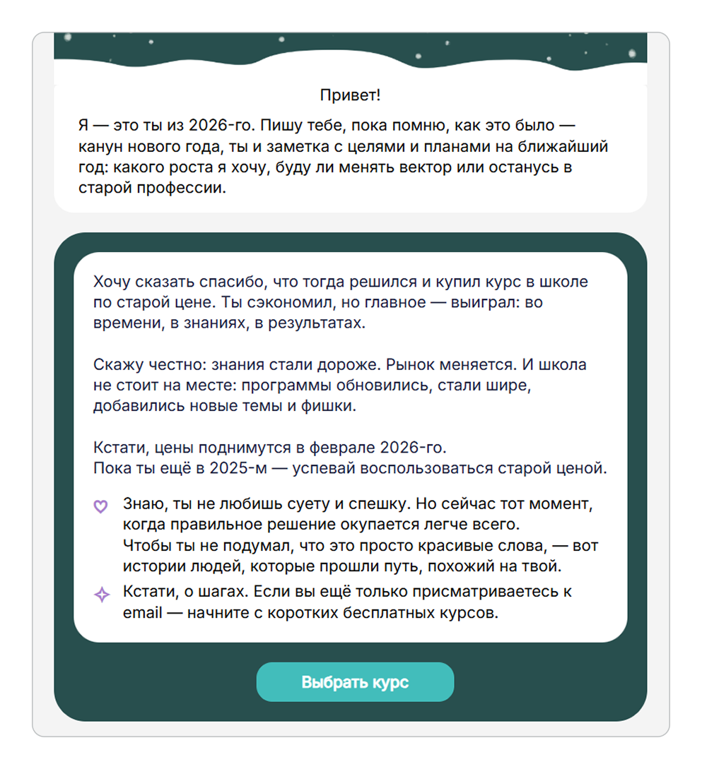 Email. Для каждого сегмента продумывайте своё предложение. Например, людям, которые пока не сделали покупку, отправьте письмо из будущего, как это сделал Unisender. Расскажите, кем они могут стать через год благодаря вашему продукту, и подскажите, как сделать первый шаг — добавьте ссылку или кнопку.