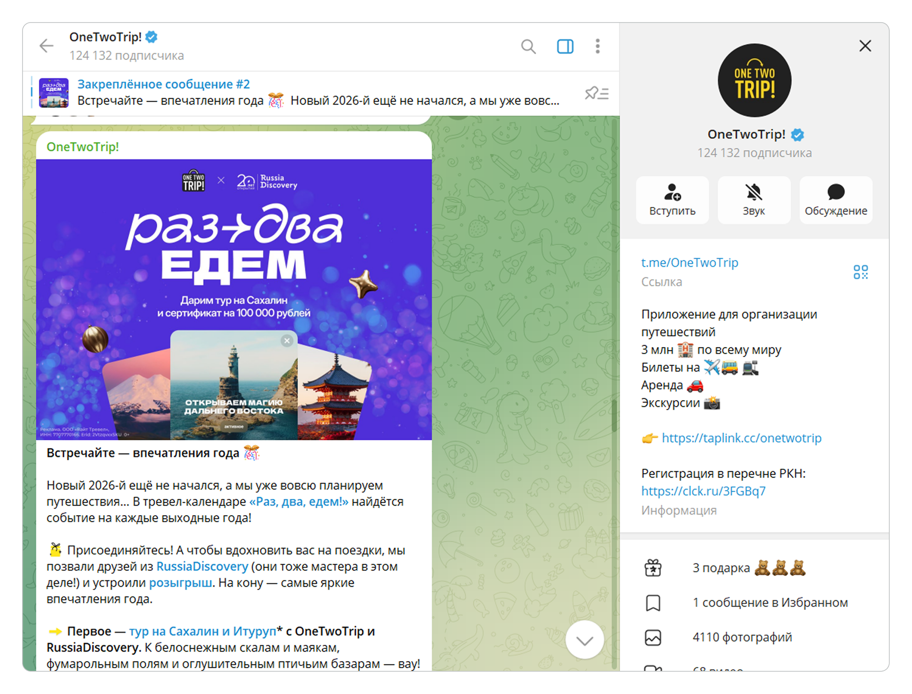 Мессенджеры. Придумайте инфоповод, напишите новость или запустите розыгрыш, как это сделал OneTwoTrip! Такой формат хорошо работает для вовлечения постоянных подписчиков и продвижения акций. Главное — быть конкретным, делать продающие посты не слишком часто и доносить ценность, чтобы публикации не раздражали.
