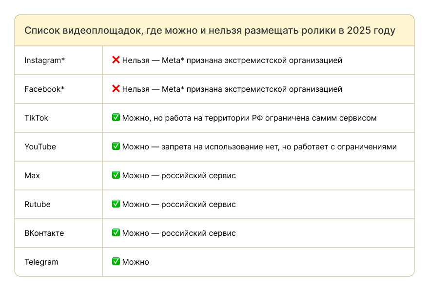 Выкладывать видео с рекламой разрешено не везде. Даже если вы продолжите отчитываться за встроенную рекламу, с 1 сентября 2025-го нельзя продвигать такие видео на запрещённых платформах.