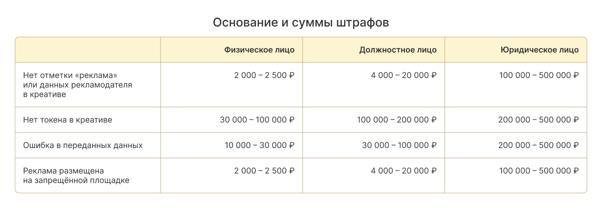 Штрафы за ошибки те же. Ответственность несёт рекламодатель, даже если работал через подрядчика. Если на креативе нет нужной информации или данные в системе переданы с ошибками, сумма штрафа будет от 2 000 до 500 000 ₽ — в зависимости от статуса нарушителя.