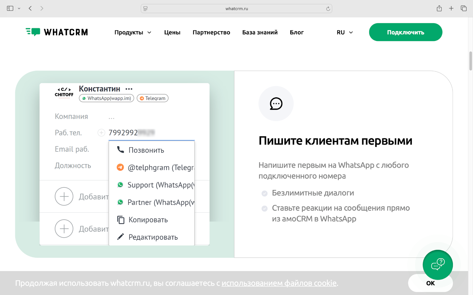 Если нужно подключить только WhatsApp: WhatCRM. У сервиса нет дополнительных функций, зато он делает доступным все фишки WhatsApp — чёрный список, уведомления о пропущенных звонках, реакции на сообщения и работу с файлами.