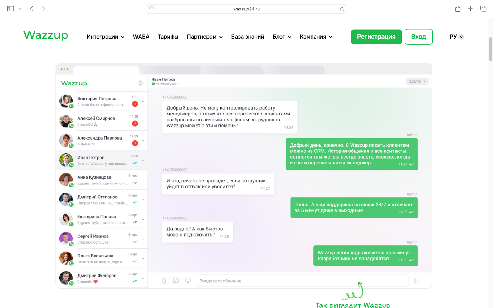 Если нужно помочь менеджерам не отвлекаться: Wazzup. Сохраняет привычный интерфейс WhatsApp — эмодзи, голосовые, статусы, но добавляет бизнес-логику: чаты не уходят вниз, пока клиент не получит ответ. При этом менеджеры видят только своих клиентов, не отвлекаясь на сторонние задачи.