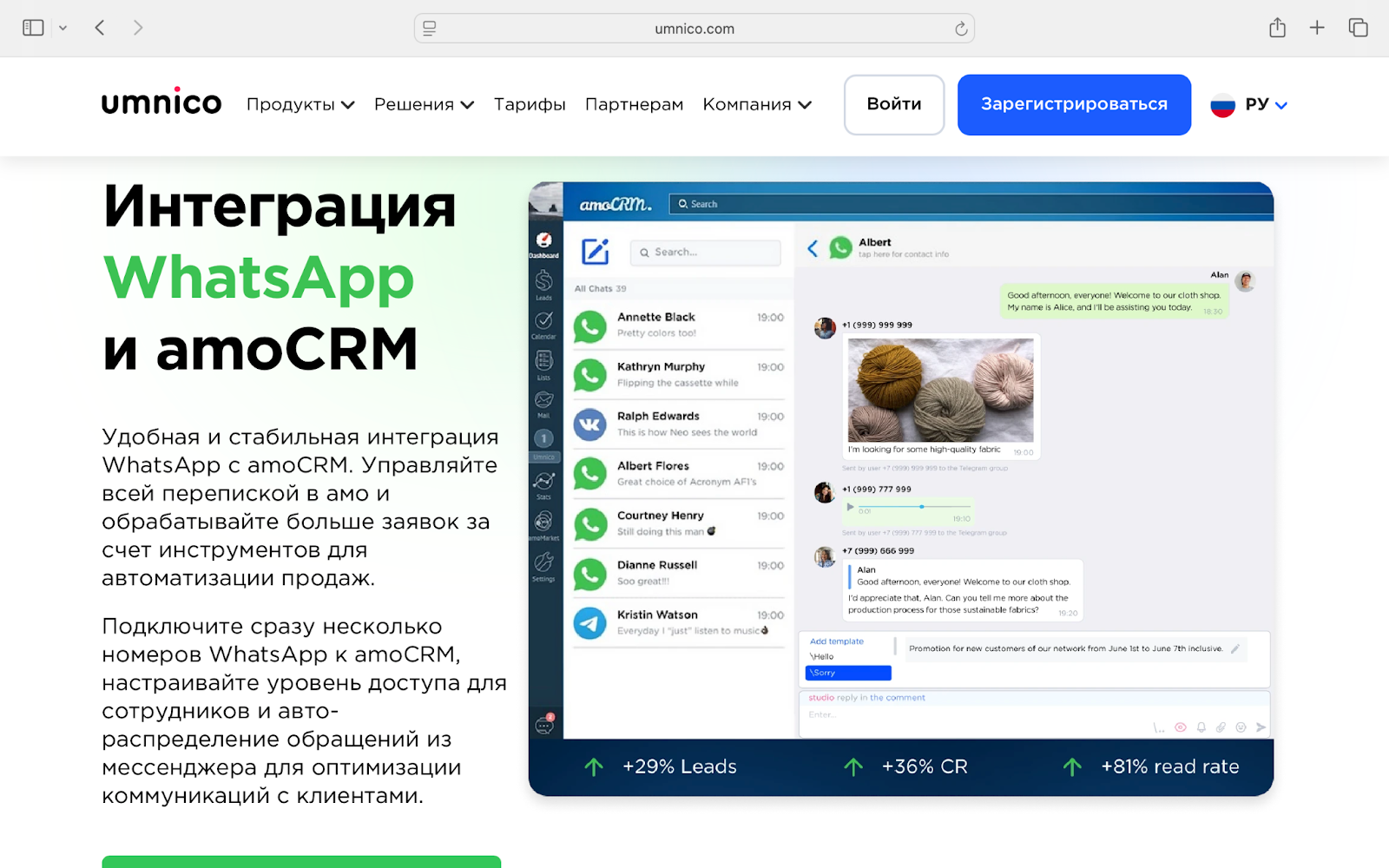 Ещё один сервис для подключения нескольких мессенджеров: Umnico. Можно настроить интеграцию с Salesbot и автоматизировать ответы, обрабатывать заявки 24/7 и минимизировать потери. Особенно эффективно это работает для роста конверсии из чатов и снижения числа недозвонов за счёт персонифицированных сообщений.