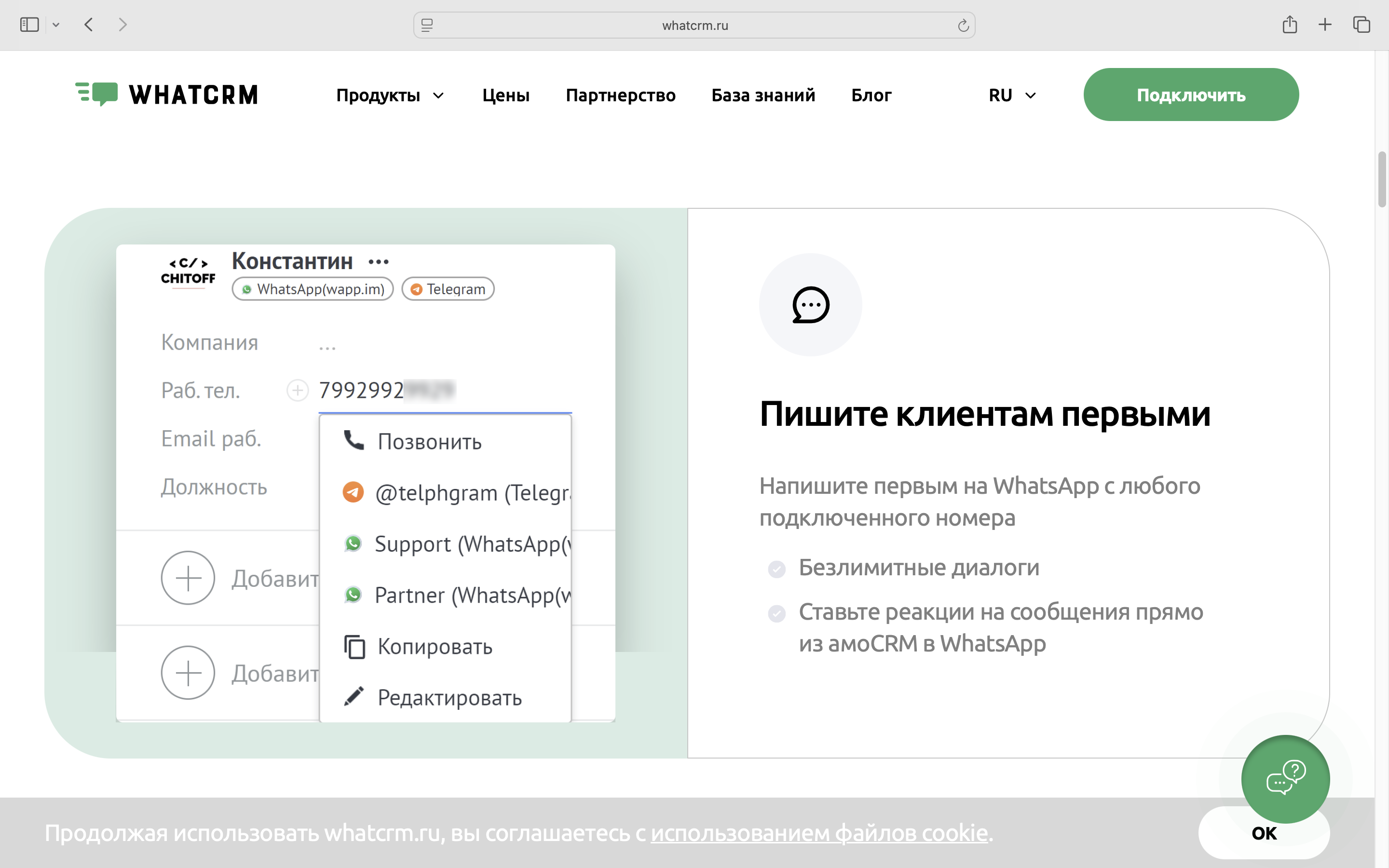 Если нужно подключить только WhatsApp: WhatCRM. У сервиса нет дополнительных функций, зато он делает доступным все фишки WhatsApp — чёрный список, уведомления о пропущенных звонках, реакции на сообщения и работу с файлами.