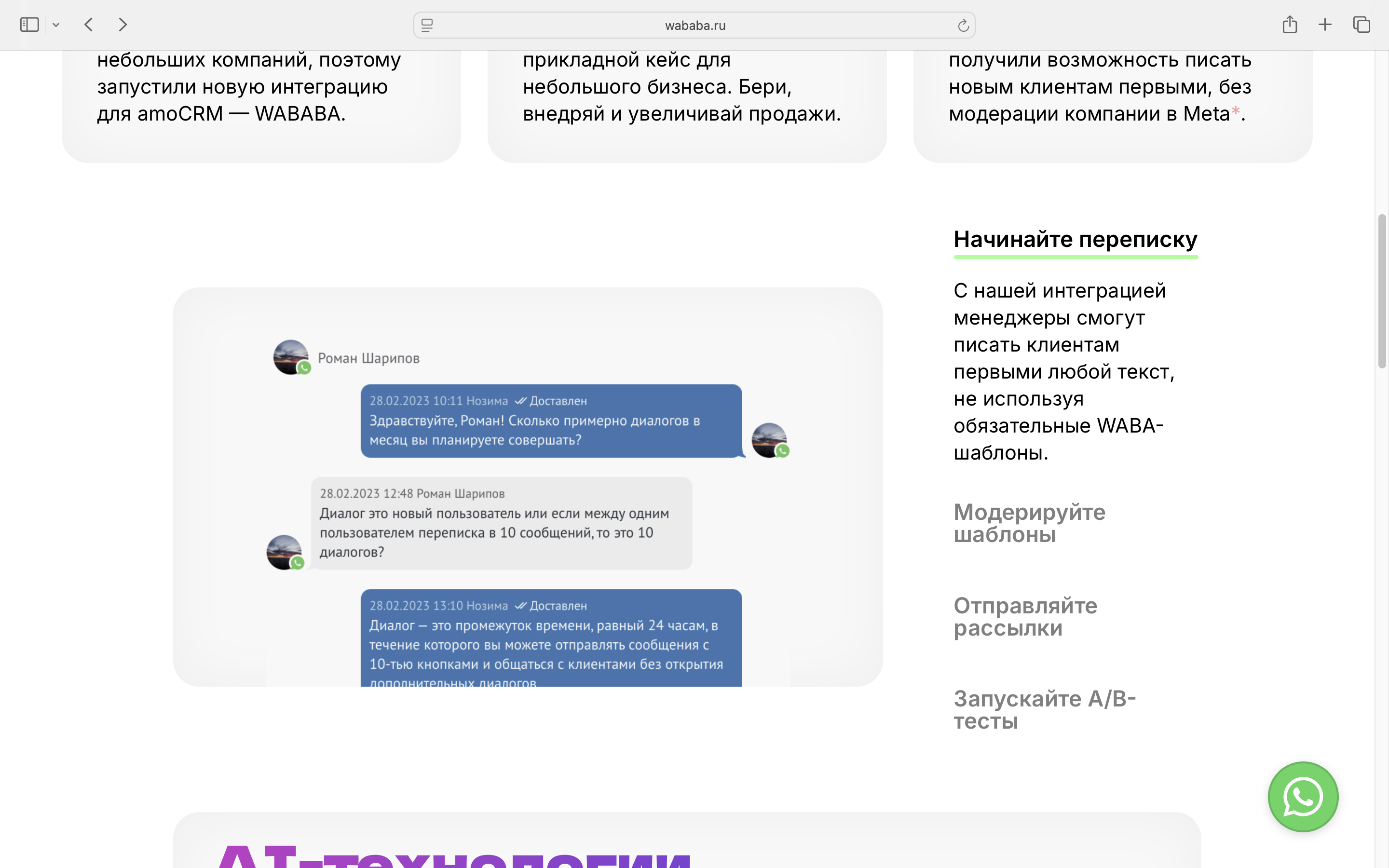 Акцент на защите данных: WAHELP. Это решение с упором на автоматизацию и безопасность. Важное преимущество — защита клиентской базы: сотрудники работают с перепиской, не имея прямого доступа к номерам, поэтому уволившийся менеджер не унесёт контакты вместе с собой.