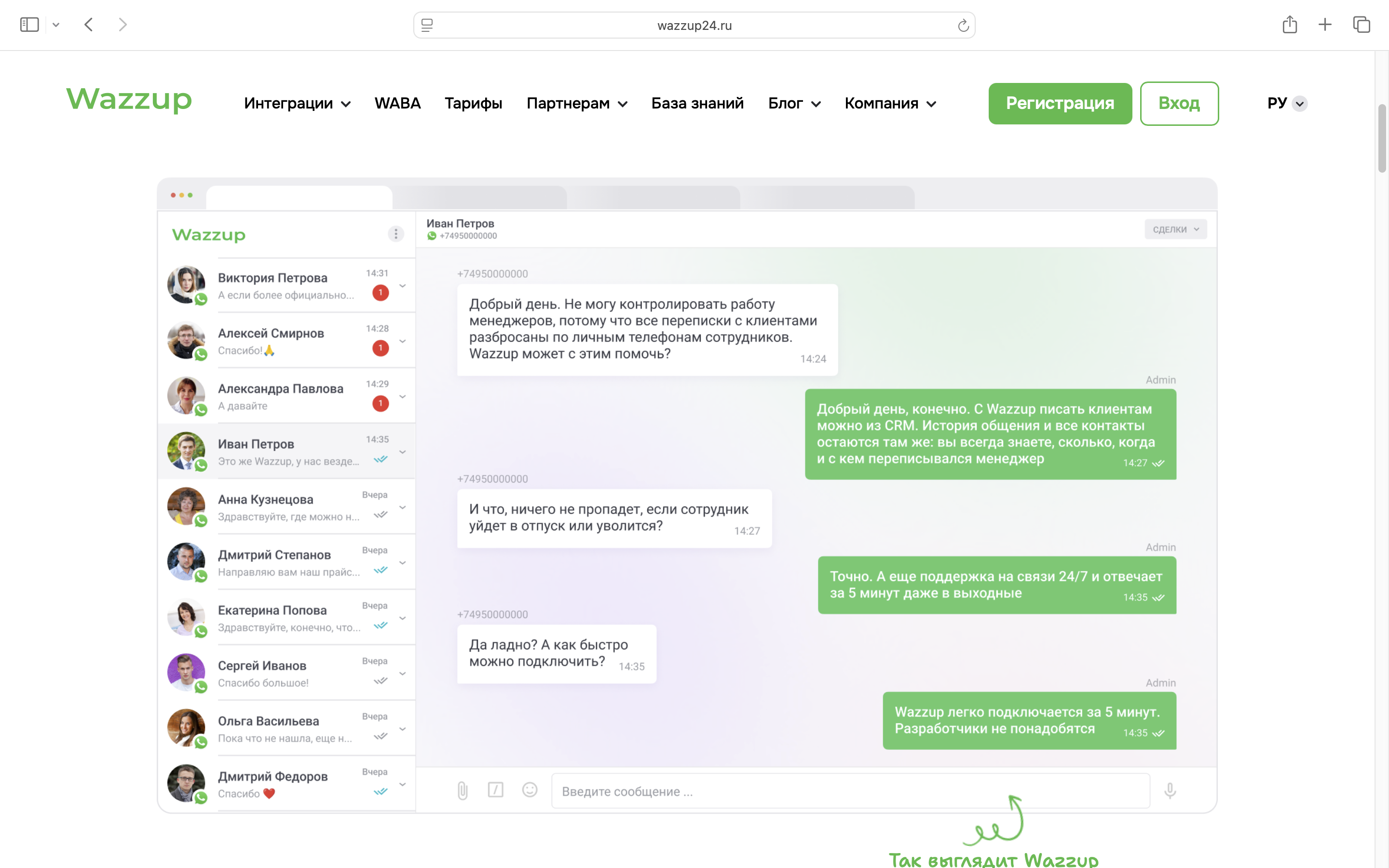 Если нужно помочь менеджерам не отвлекаться: Wazzup. Сохраняет привычный интерфейс WhatsApp — эмодзи, голосовые, статусы, но добавляет бизнес-логику: чаты не уходят вниз, пока клиент не получит ответ. При этом менеджеры видят только своих клиентов, не отвлекаясь на сторонние задачи.