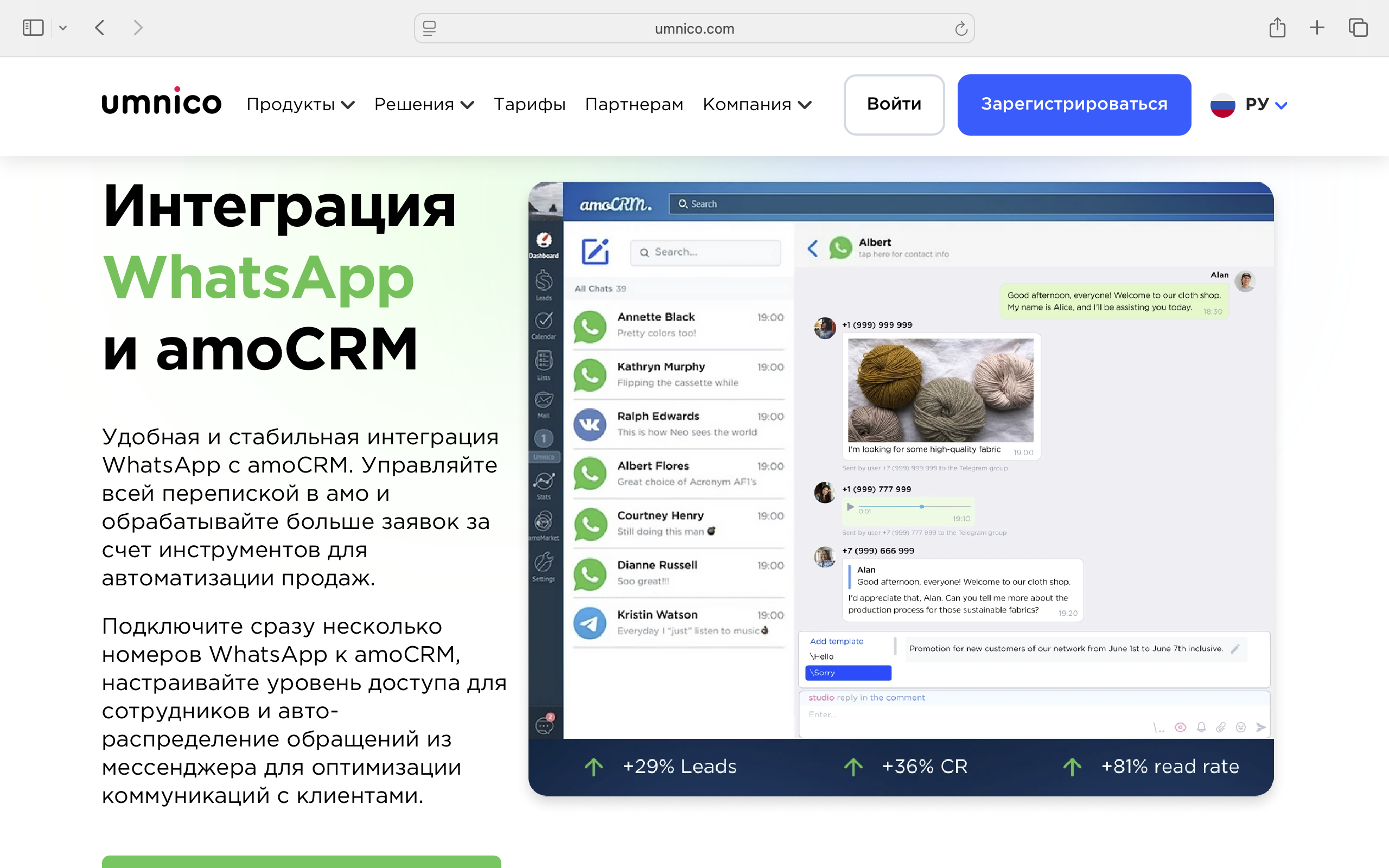 Ещё один сервис для подключения нескольких мессенджеров: Umnico. Можно настроить интеграцию с Salesbot и автоматизировать ответы, обрабатывать заявки 24/7 и минимизировать потери. Особенно эффективно это работает для роста конверсии из чатов и снижения числа недозвонов за счёт персонифицированных сообщений.