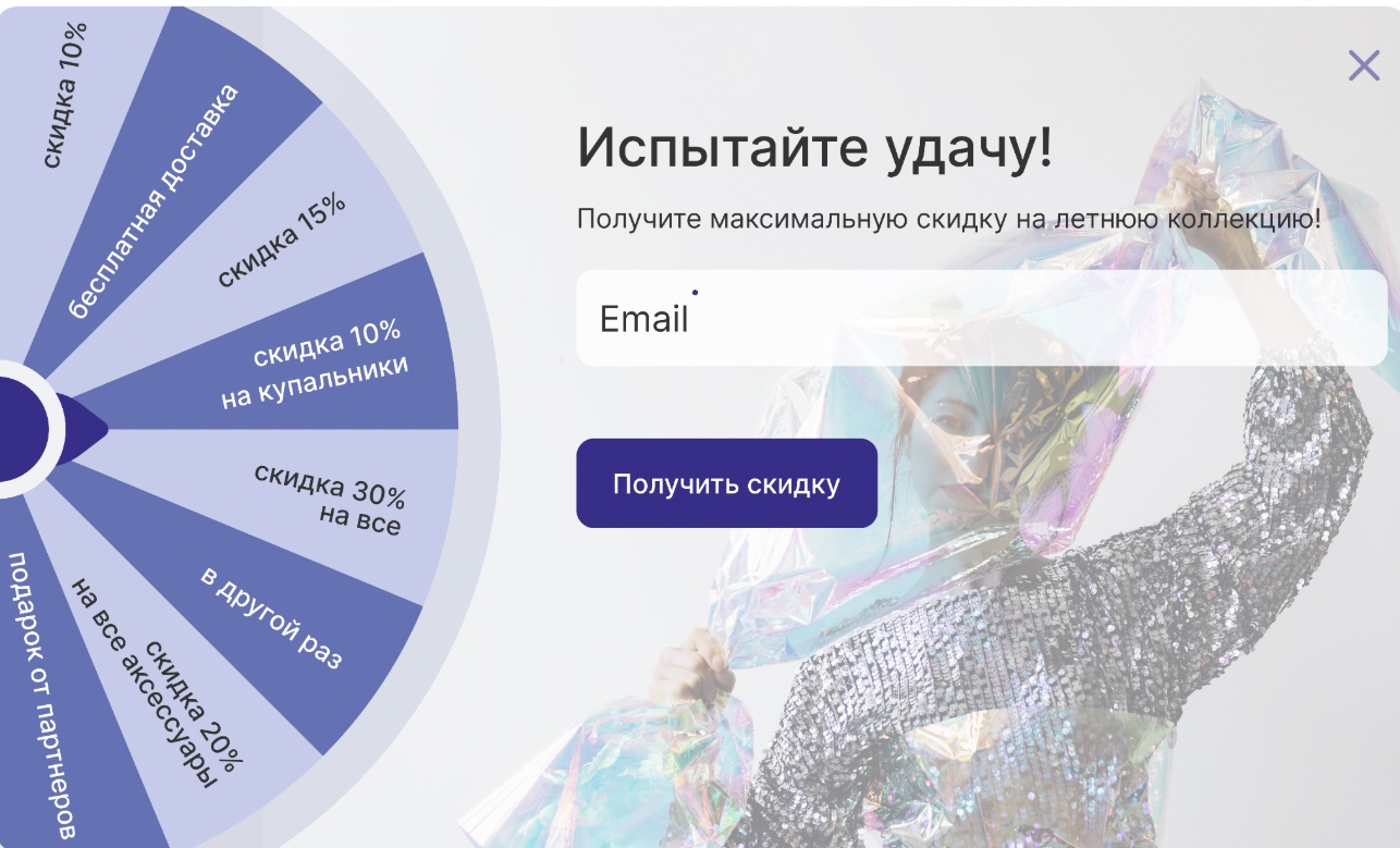 Многошаговый попап (multi-step pop-up). Здесь окно вовлекает пользователя в диалог с сайтом. Например, короткий квиз помогает понять, что именно ищет человек, и сразу показать подходящее предложение. А «Колесо фортуны» с розыгрышем призов вызывает интерес и азарт у пользователя.