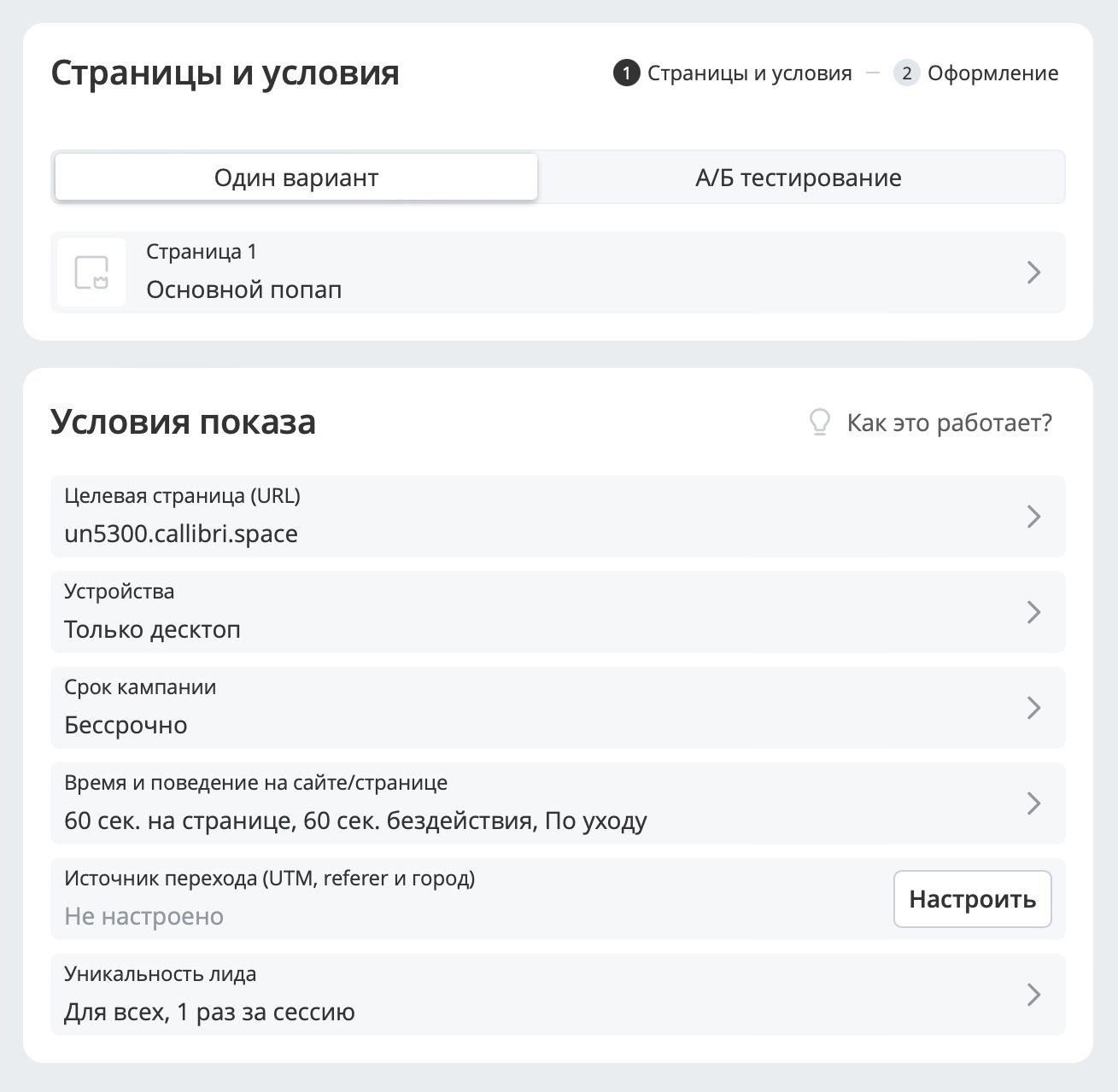 - Определите, когда и кому показывать. Настройте условия показа: при входе, через определённое время, при прокрутке страницы или попытке закрыть вкладку. Можно задать фильтры по устройству, региону и источнику перехода.