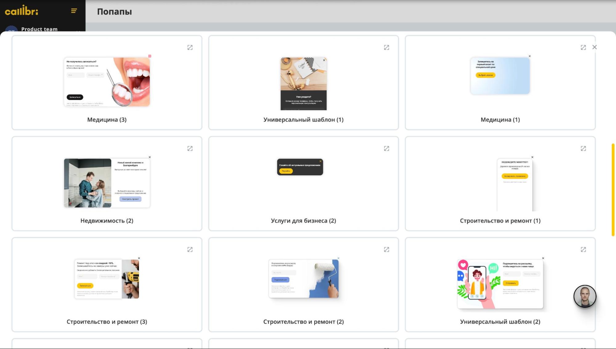 Помимо гибких настроек показа, у попапов Callibri есть галерея готовых решений с современными дизайнами. Если нет времени собирать окно с нуля, выберите подходящий вариант из коллекции. Каждый шаблон легко адаптируется под бренд: меняйте цвета, тексты и другие важные параметры. Благодаря этому попап органично встроиться в общую стилистику сайта.