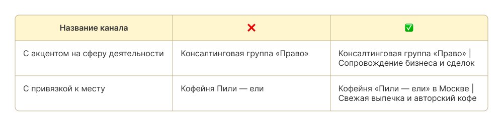 Название и описание канала. Наполните их ключевыми словами, по которым вас может искать целевая аудитория. Чётко обозначьте сферу и ключевую задачу, которую решаете. Например, не «Юрист», а «Юридическое сопровождение бизнеса и сделок». А если вы привязаны к конкретному городу, добавьте и геолокацию.