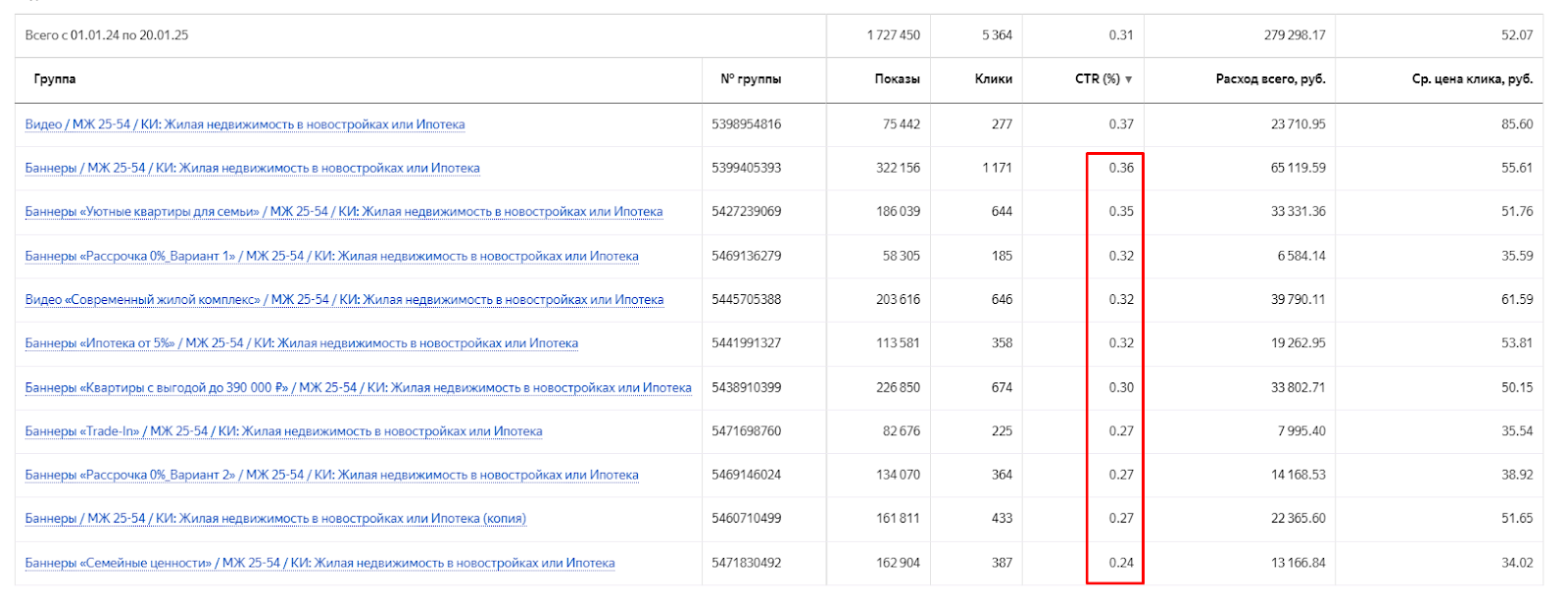 Ниже — статистика по 10 баннерам за период с 1 января 2024 по 20 января 2025 года. Чаще всего они запускались последовательно, иногда — параллельно. CTR по группам колебался от 0,254% до 0,36%.
