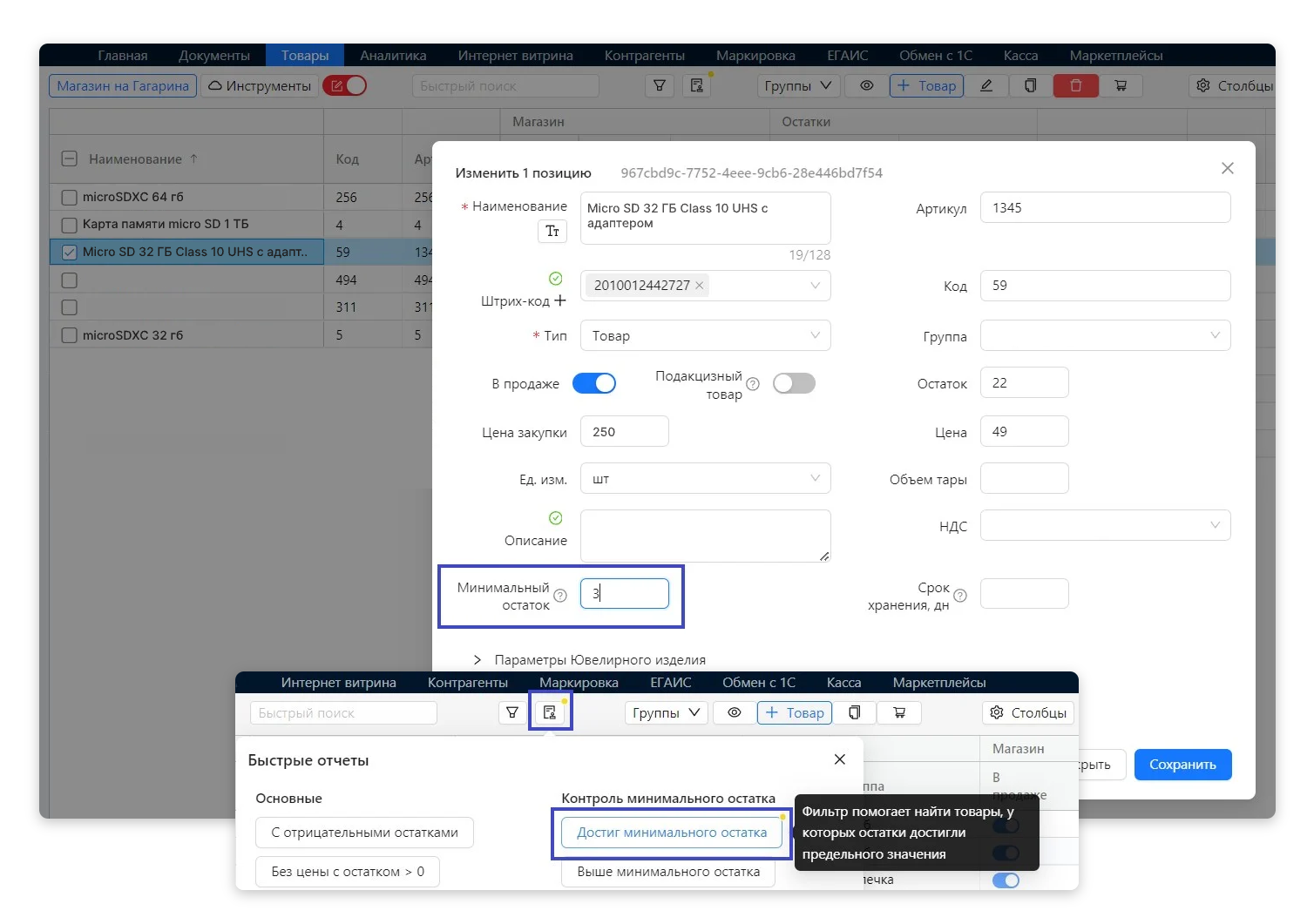 Минимальный остаток. Можно указать, при каком количестве товаров делать следующий заказ. Допустим, у меня осталось 10 смартфонов определенной модели — товароучётная система Эвотор уведомит об этом, поможет быстро сформировать заявку поставщику.