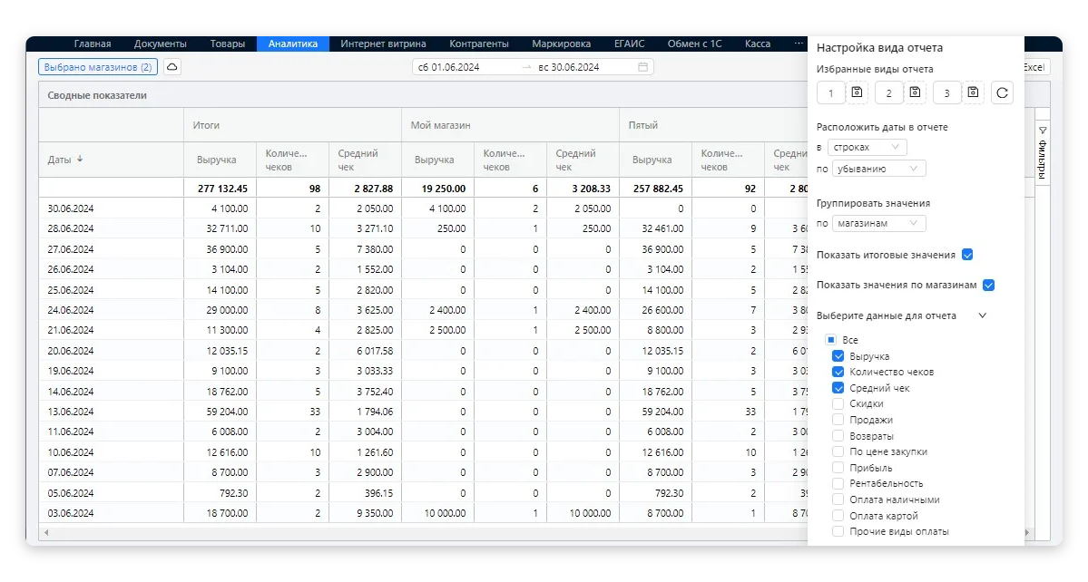 Аналитика. В 1C есть дашборд с бизнес-показателями: выручка, долги, выплаты. Можно анализировать данные по магазинам и отдельным кассам, контролировать любые операции с товарами, оценивать доходы и расходы.