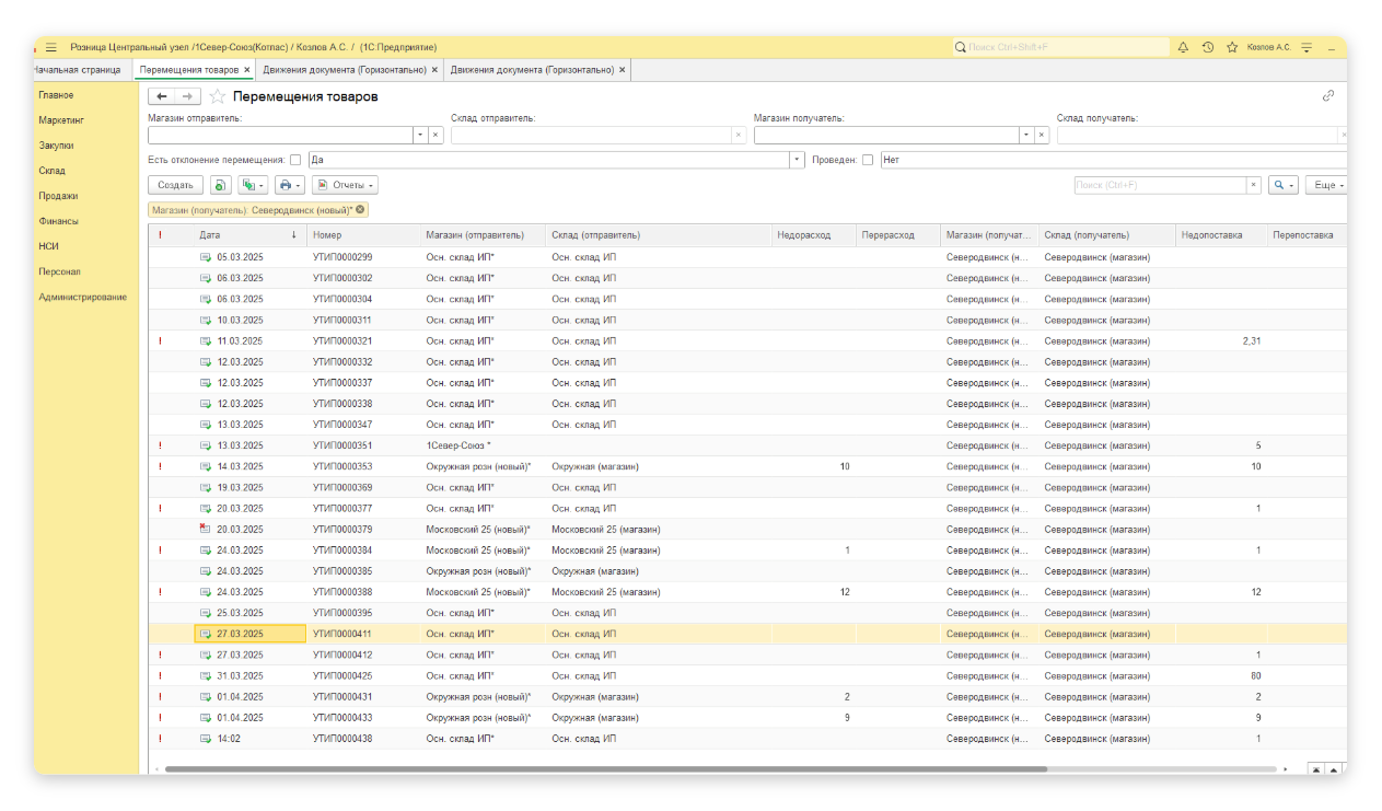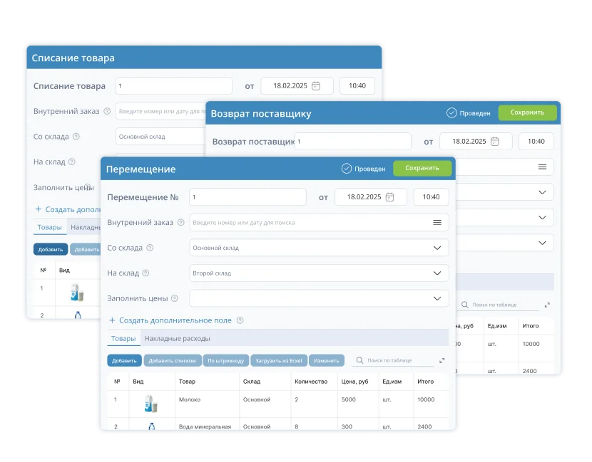 - Отображение всех стандартных операций: перемещения, списания, приемки, возвратов.