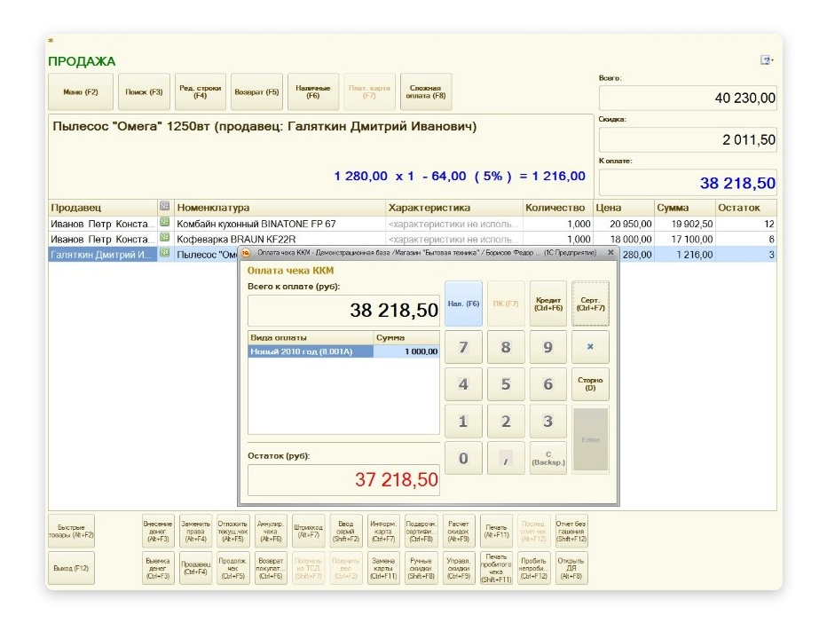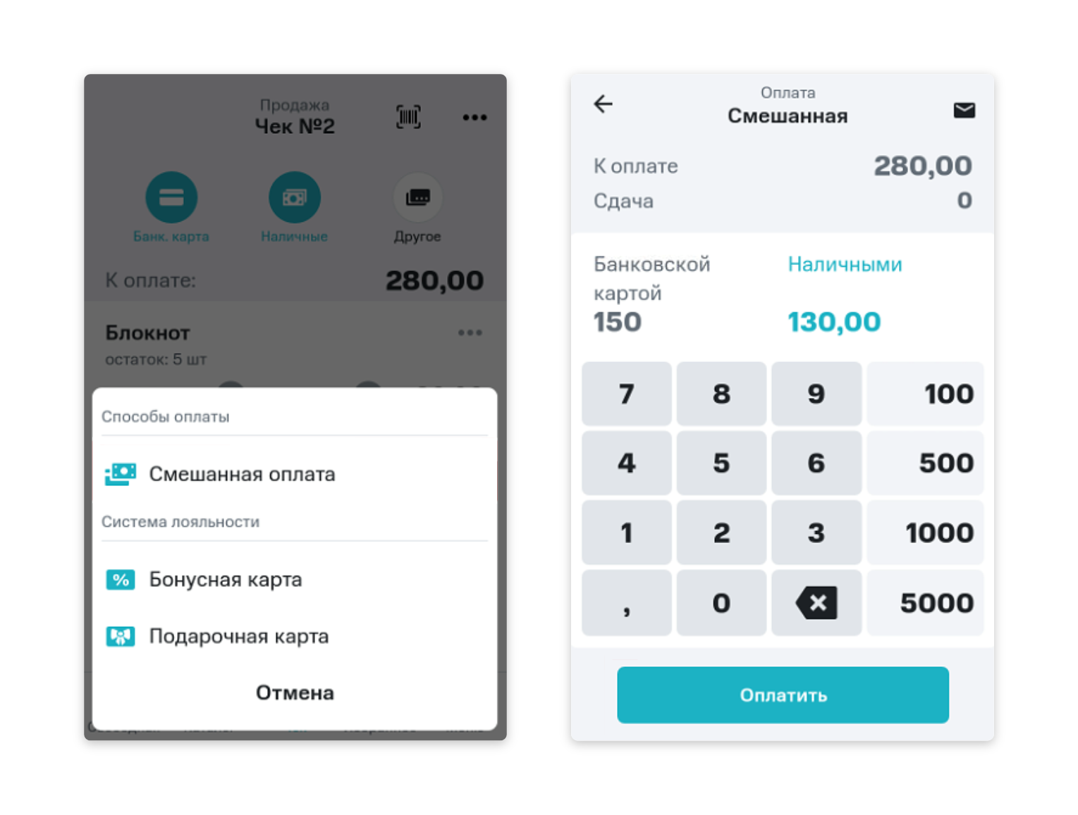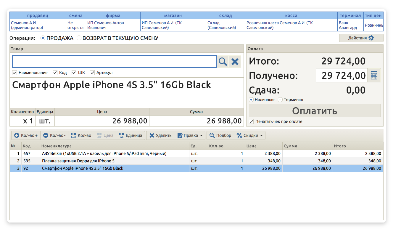 - Рабочее место кассира для приема оплат и формирования чеков — отложенных, на аванс, предоплату, есть оплата по СБП, закрытие смены.