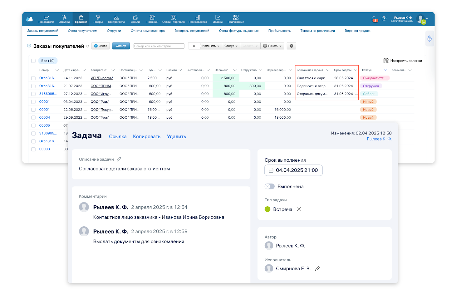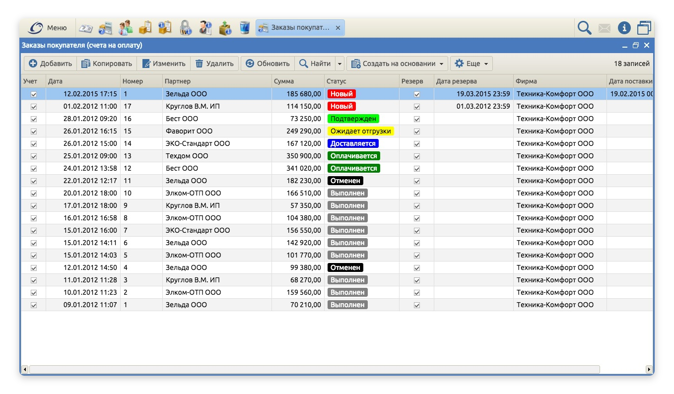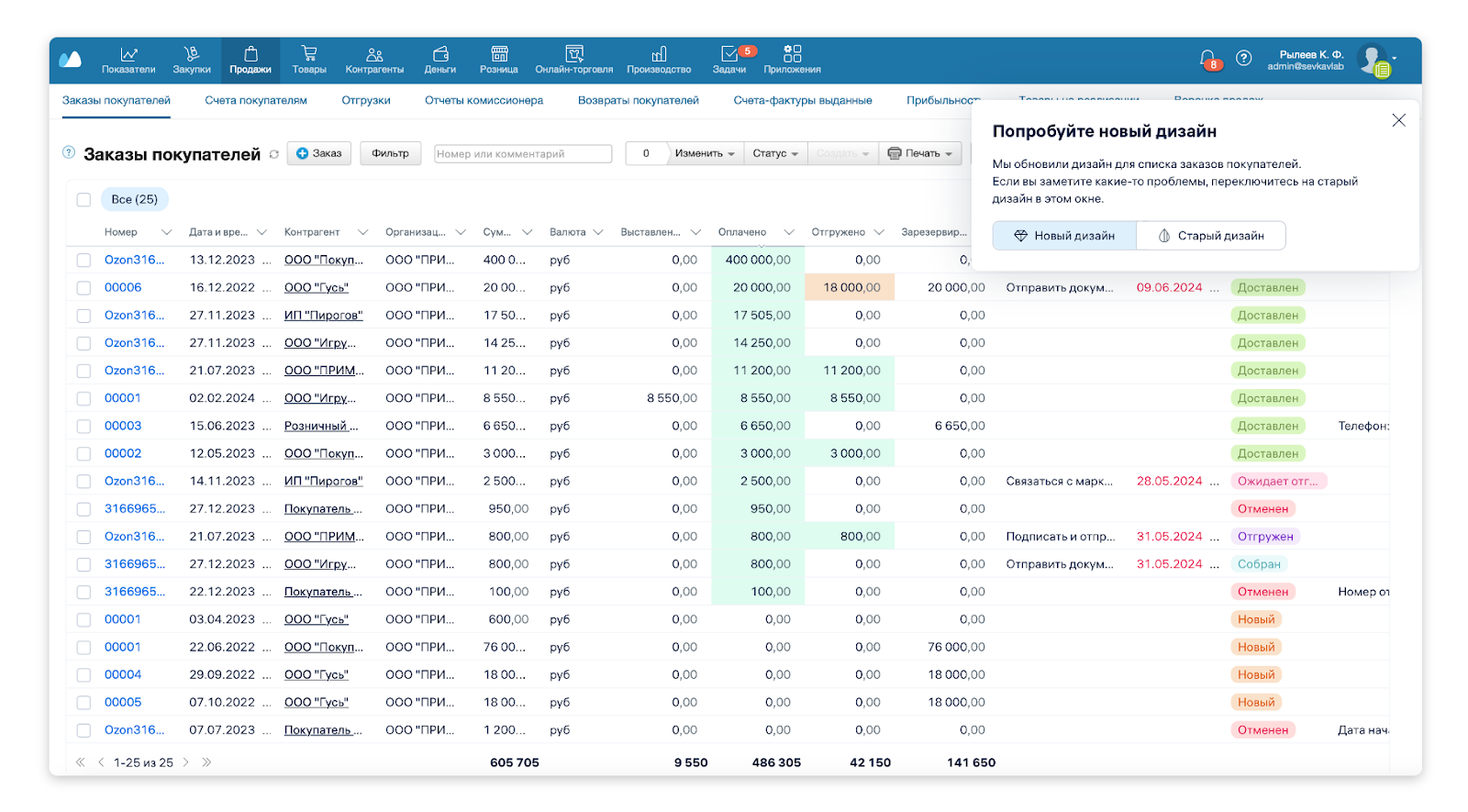 - Контроль статусов заказов с основными данными: долгами, сколько заказано, отгружено и оплачено.