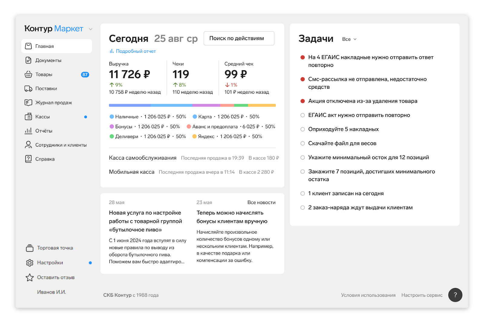 Аналитика. В карточках товаров есть данные про их движение, график продаж, остатки, себестоимость и выручку. На главной странице отображаются данные по выручке (наличными и картой), количеству чеков, сумме продаж, величине среднего чека и графику продаж. Есть отчёты по выручке, остаткам товаров, НДС, срокам хранения.
