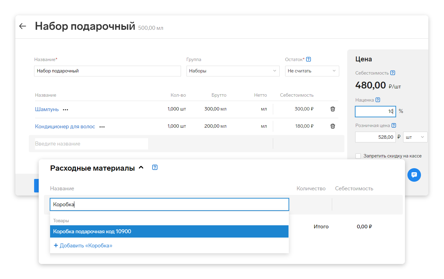 Создание наборов, разукомплектация. Можно создать наборы, добавив в них товары и расходные материалы вроде упаковки. При этом автоматически посчитается себестоимость набора.