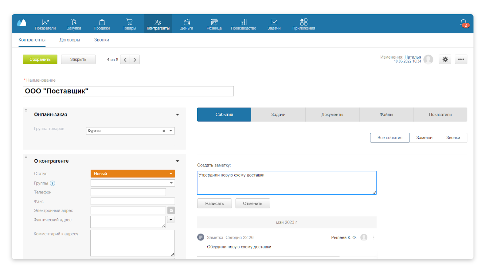 Лента событий. Это инструмент, который позволяет быть в курсе всего происходящего в компании. Например, сотрудник оставляет комментарий в карточке контрагента или в документе — информация появляется в ленте. Можно настроить уведомления — какую информацию хотите видеть в ленте, а какую — нет.