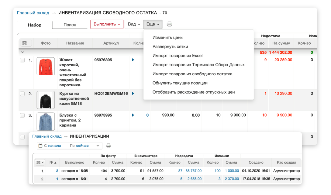 Инвентаризация. Можно проводить полную и частичную инвентаризацию — в сервисе есть настройки, чтобы не проверять повторно уже рассмотренные позиции. Система учёта продаж товаров подводит итоги инвентаризации и отображает список всех проведенных проверок.