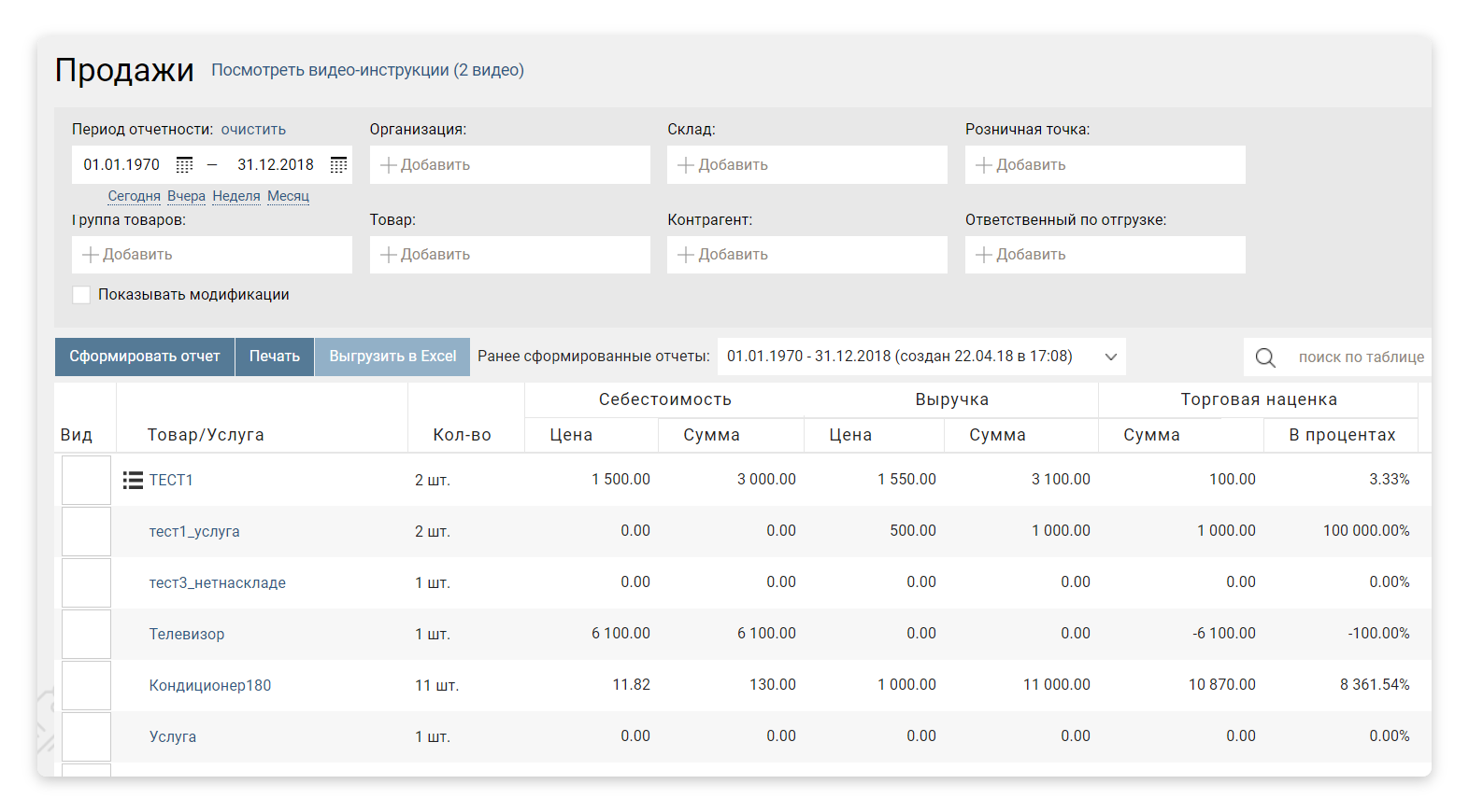 - Большое количество отчетов: по наценке, закупочным ценам, продажам по клиентам и сотрудникам.