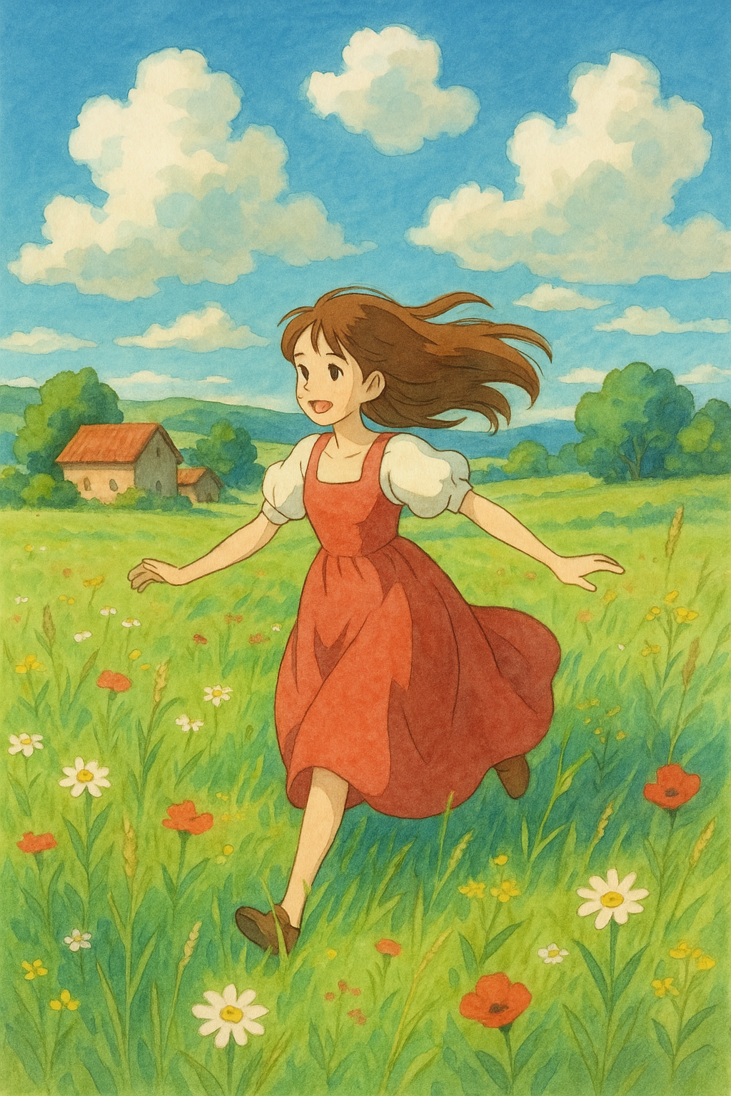 Пример: спокойная сельская сцена в стиле студии Ghibli. Молодая девушка в сарафане бежит по полю, заросшему высокой травой и полевыми цветами. Её волосы развеваются на ветру. Пушистые белые облака плывут по ярко-голубому небу. Теплая, ностальгическая атмосфера с мягкой акварельной эстетикой.