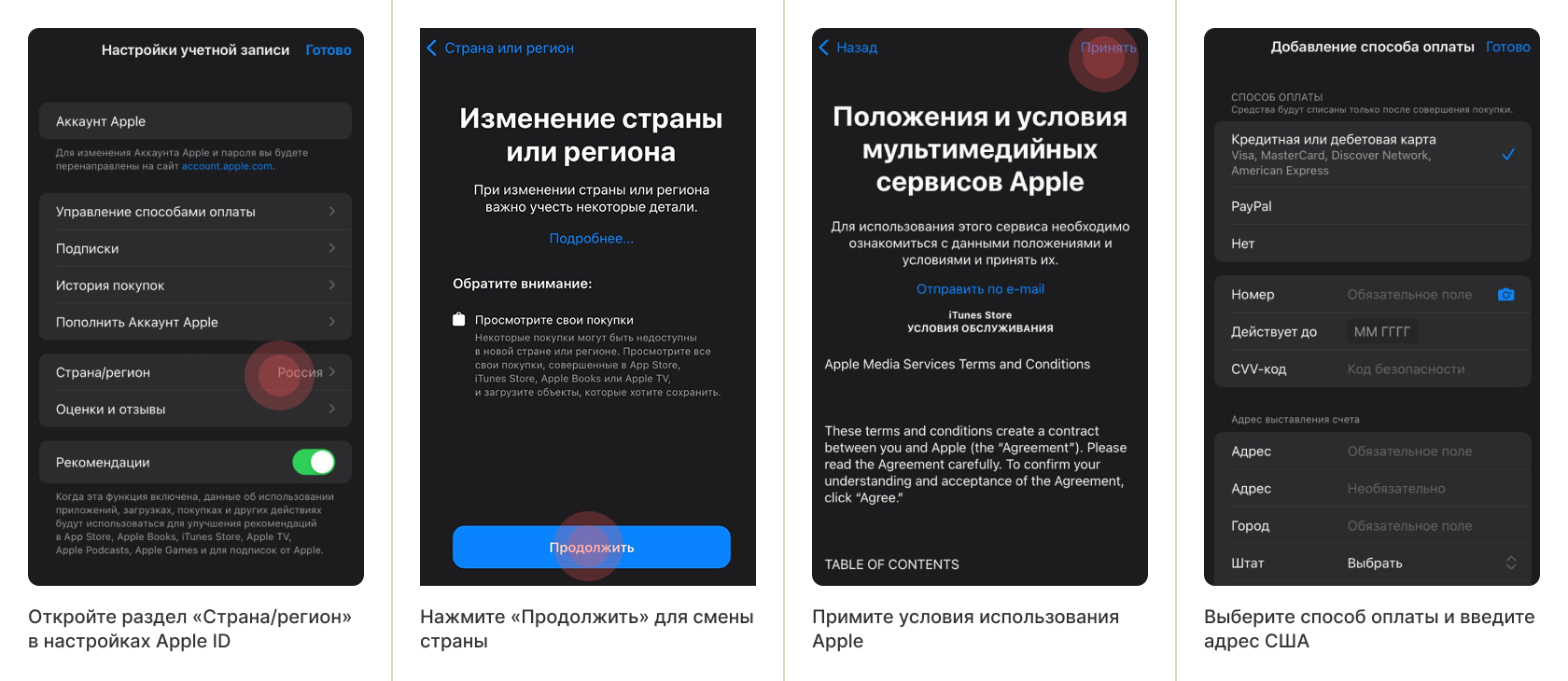 - Выберите «США», подтвердите условия, впишите любой реальный адрес и индекс этой страны. Например, данные отеля.