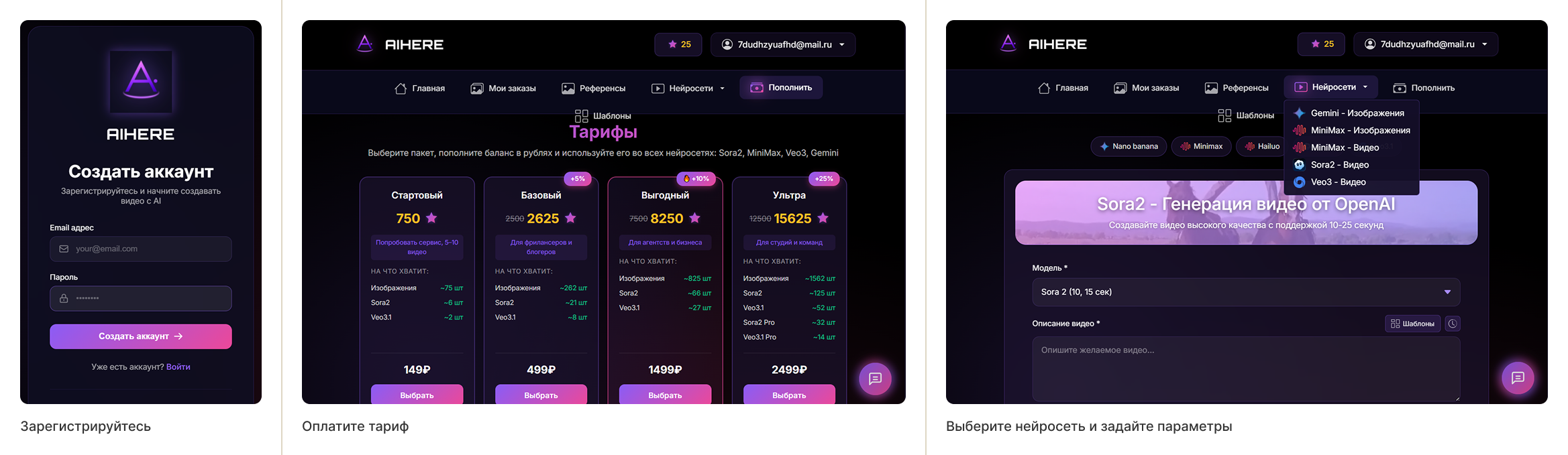 Регистрация через партнёра. В этом варианте пользователь работает не с самой Sora 2, а с российским сервисом, который подключил модель по API и предоставляет доступ на своих условиях. Главный плюс — простота и скорость: не нужно искать иностранные карты, менять настройки или ждать инвайт-код от OpenAI. Минус — стоимость: платформа делает наценку. Ещё выбор функций может быть ограничен по сравнению с оригинальной нейросетью.
