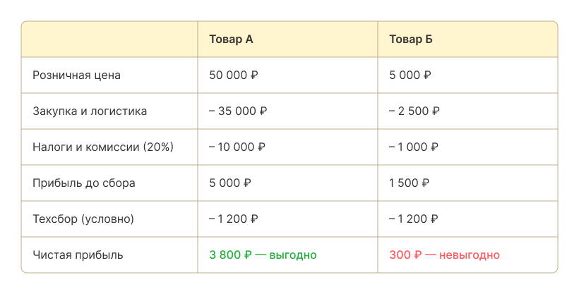 👉 Пример: вы продаёте чайник за 5 000 ₽ и получаете 800 ₽ чистой прибыли. Если сбор составит 750 ₽, заработок упадёт до 50 ₽. В такой ситуации товар становится нерентабельным — его нужно выводить из ассортимента или повышать на него цену.